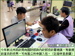 今年新北市民政局特向國防部、內政部役政署建議,首度預先統計各時段新訓中心可收訓人數,讓有意提前當兵役男,自即日起至六月十日止,可向戶籍所在地的區公所提出申請提前入營,預計截止後一週,就可知何時入營,內政部估計,替代役男最快六月二十五日就可徵集入伍,最晚八月底,已提出申請的役男都將全數入營。